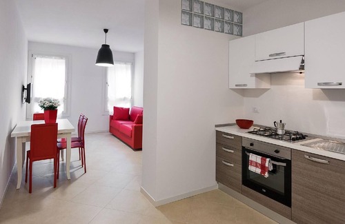 At the entrance, there is the kitchen area equipped with everything you need to cook and a white table with red chairs. Then, you find the living room with a new sofa bed. The room has a double bed, bedside tables and a large closet. The bathroom, like the rest of the apartment is elegant and it has a large shower. It can accommodate up to 4 people.