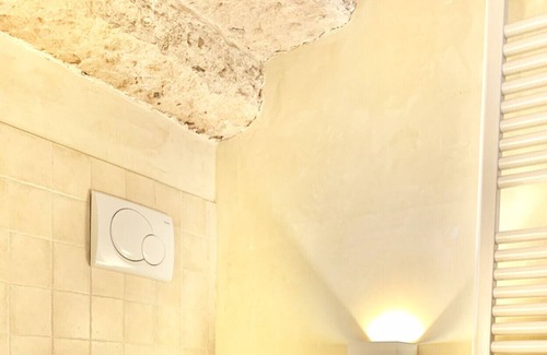The double bedroom, very bright, is characterized by the access to the garden and by a stone wall. The latter is also the main feature of the bathroom, consisting of toilet, bidet and shower.